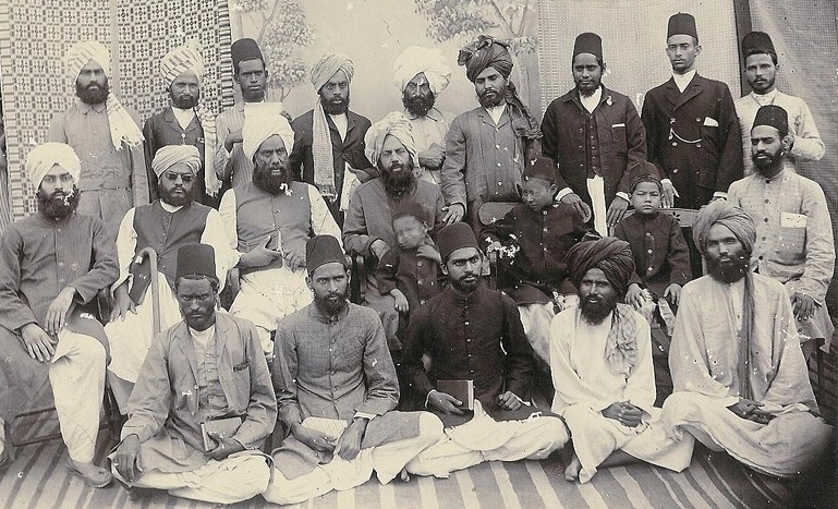 Mirza Ghulam Ahmad (Mitte) und seine ersten Anhänger. Rechts neben ihm ist sein späterer Nachfolger Nuur ud-Din zu sehen im Jahr 1899