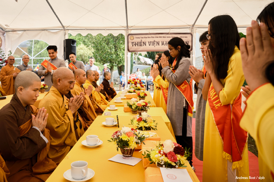 Festlich gedeckte Tafel zu Ehren der Nonnen und Mönche bei der Einweihung des buddhistischen Tempels in Bad Gottleuba-BerggießhĂŒbel. 2023