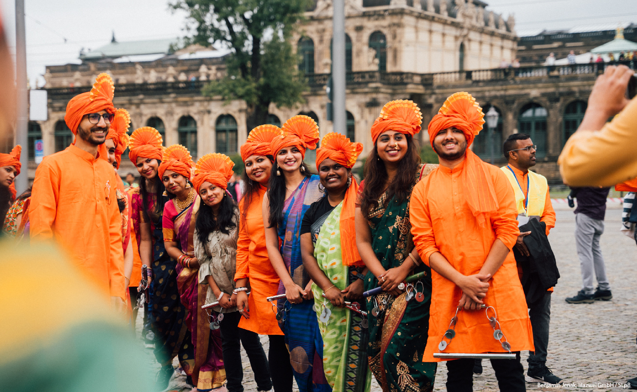 TĂ€nzerinnen und TĂ€nzer einer hinduistischen Feier zum Geburtstag des Gottes Ganesha vor dem Zwinger in Dresden. 2023